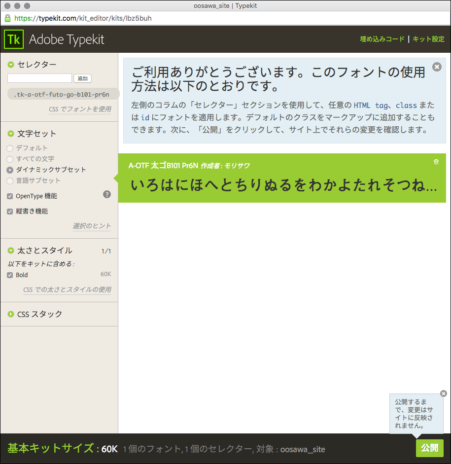 他に使用するフォントも先ほど設定したキットに追加し、最後に右下の公開をクリックします。